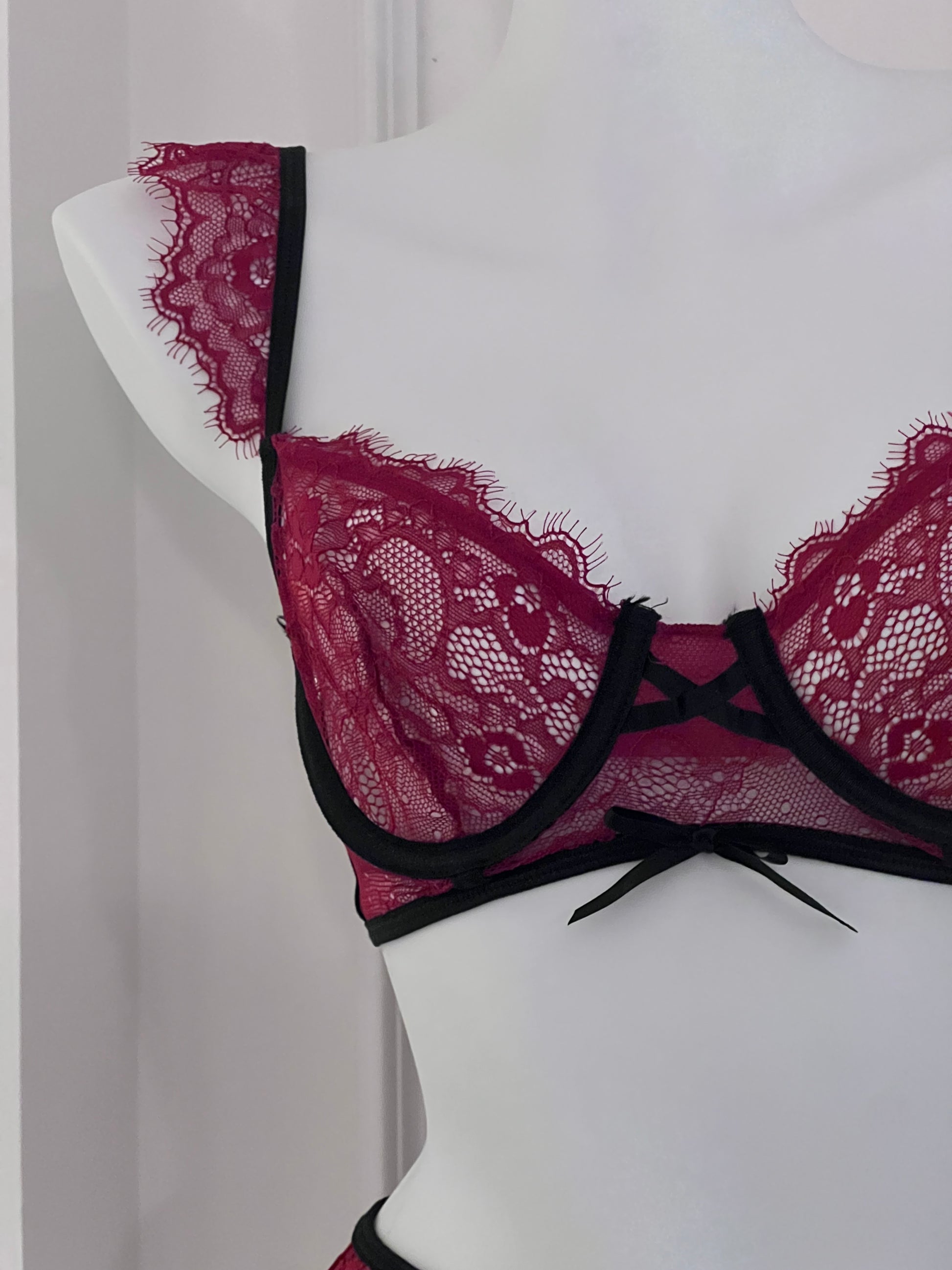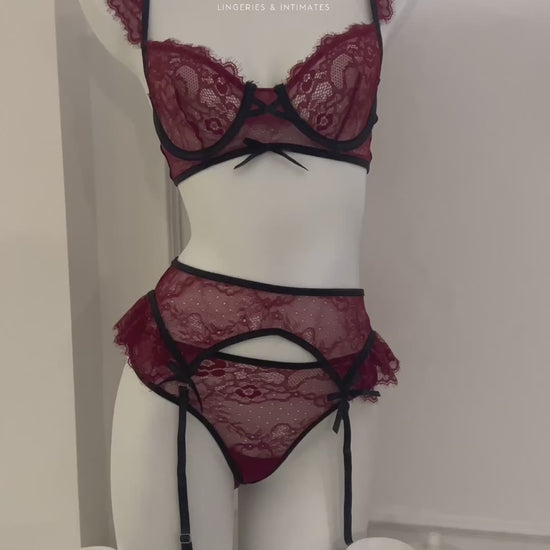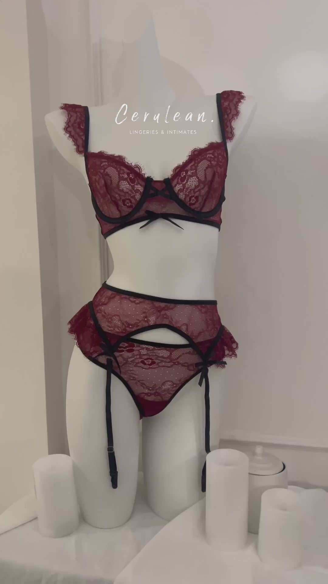 - The dark red lingerie set is always a classic choice that you won't regret. This set features exquisite lace patterns, with even the lace details having a rich texture, accented by black trim.