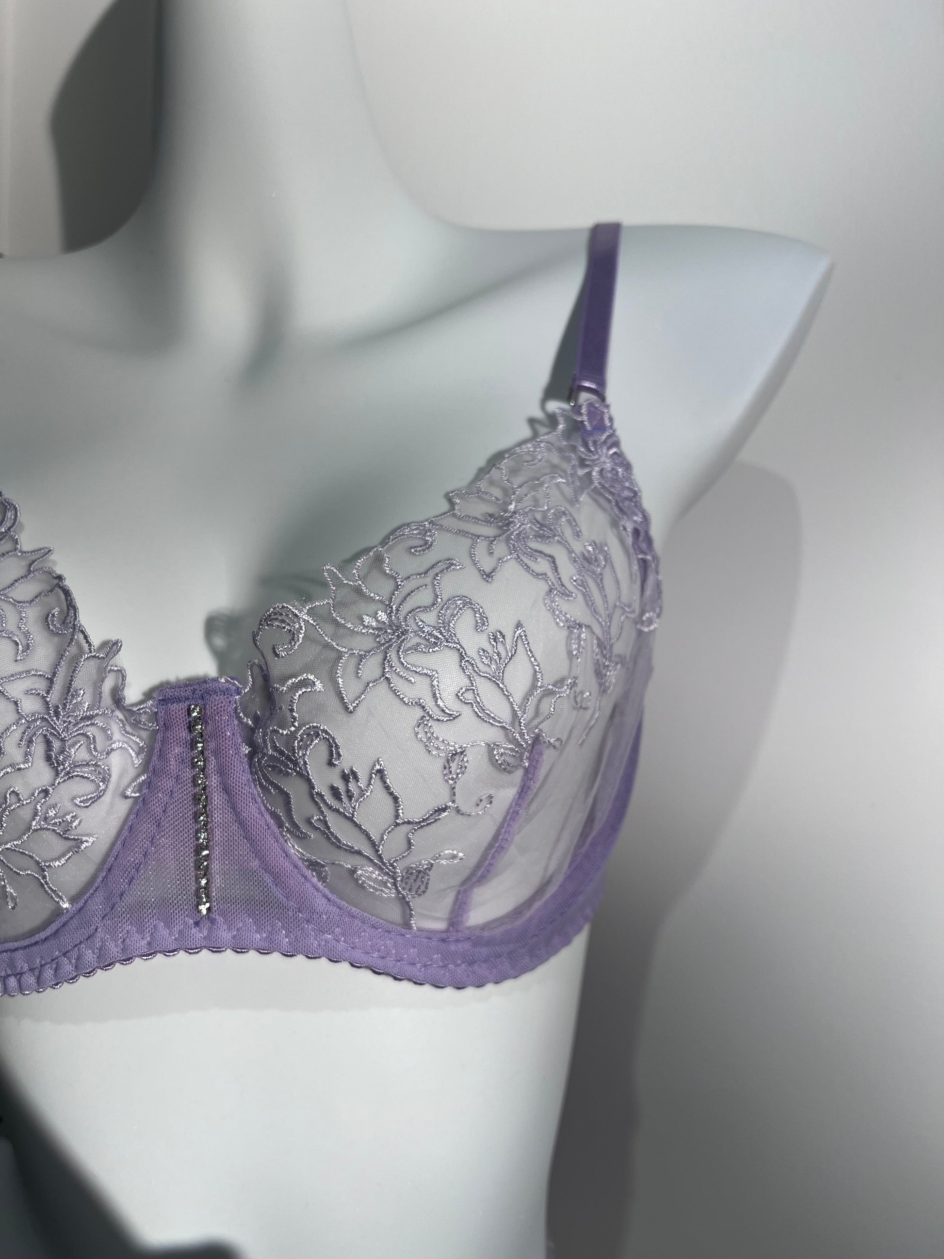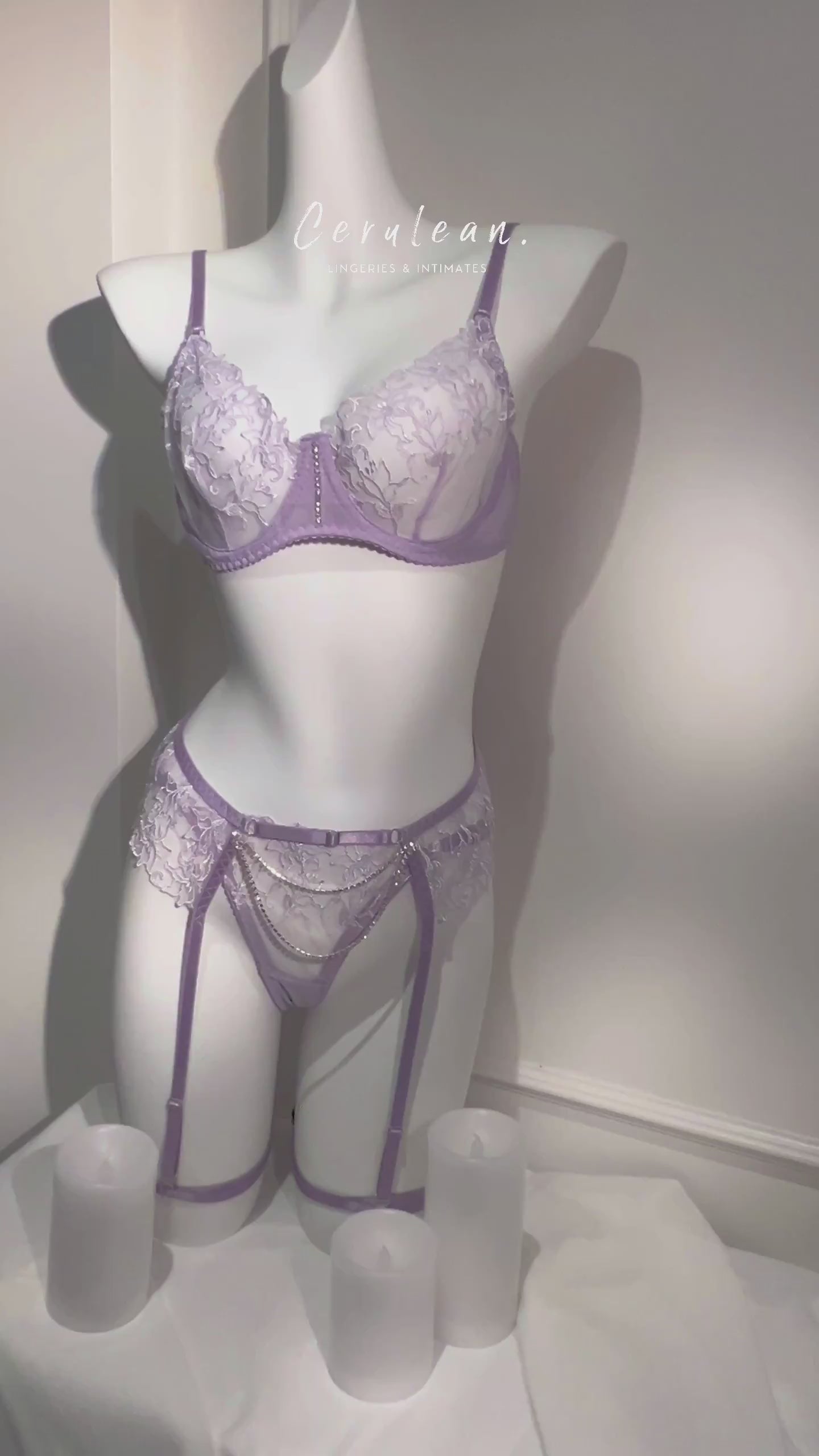 - The embroidery is made from intertwined silver and violet/white threads, with small yet exquisite silver rhinestones embellishing the centre of the bust and the waist. Even in dim lighting, the beauty of this lingerie set can be clearly seen.