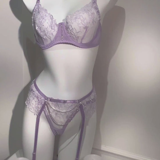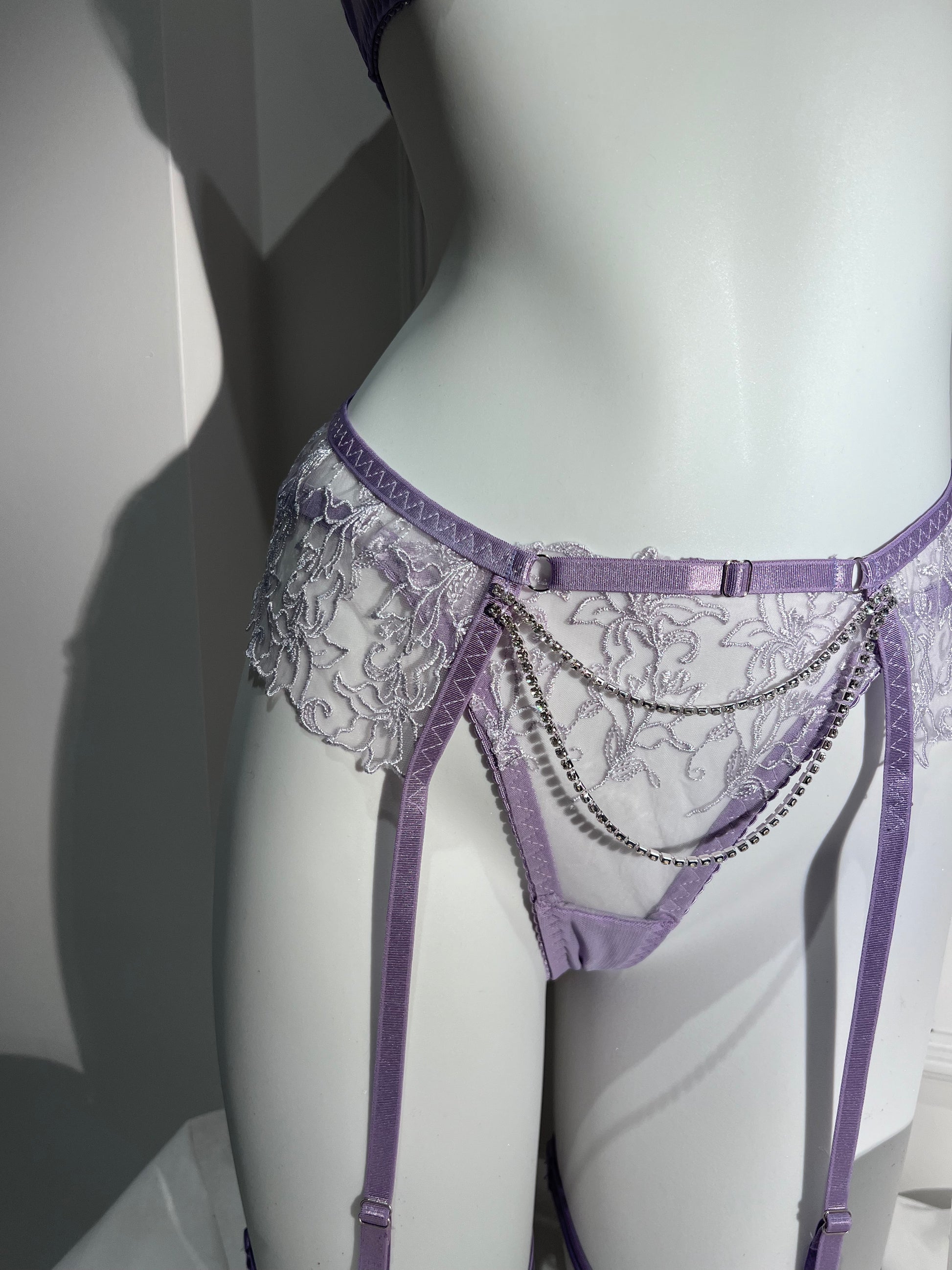 - This complete lingerie set in violet exudes sensuality. The set includes a bra, thong, garter belt, and leg garters/loops. It comes in violet and white options.